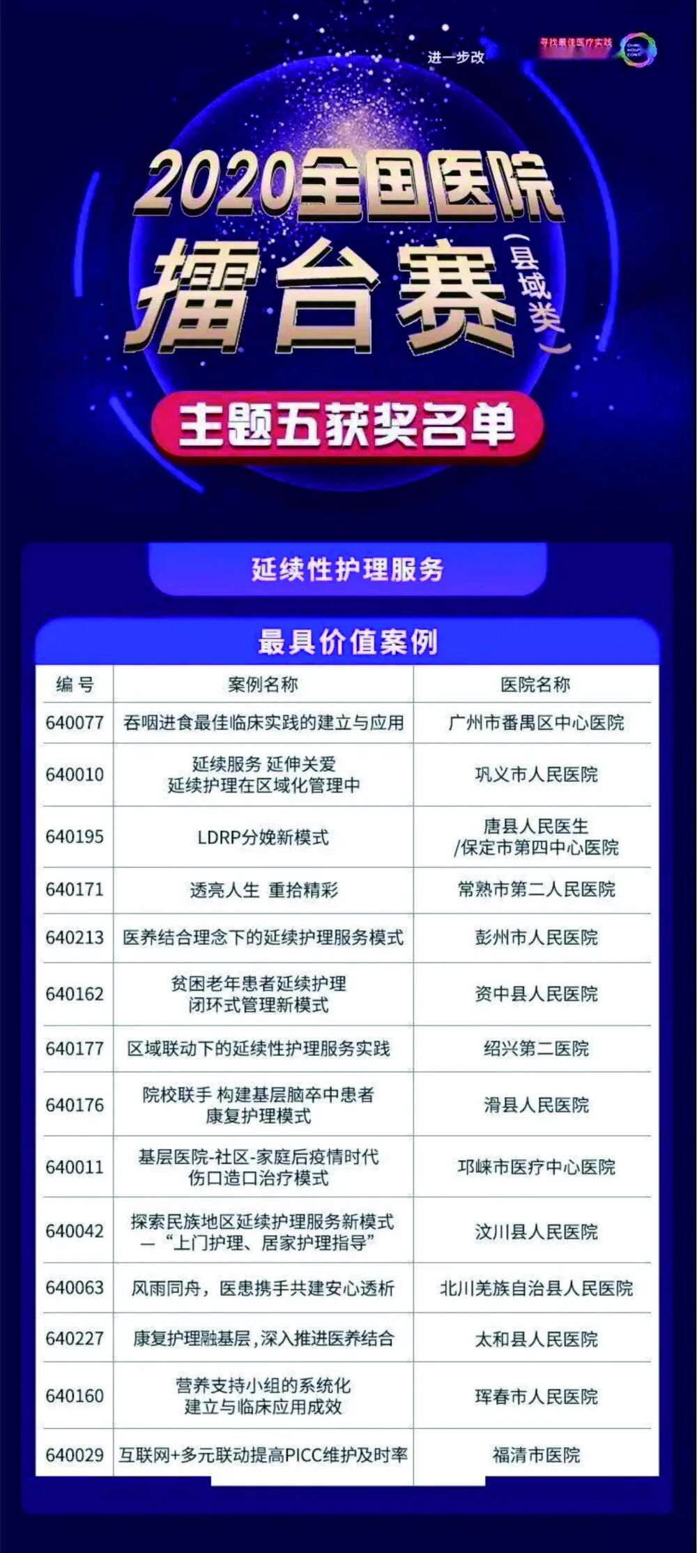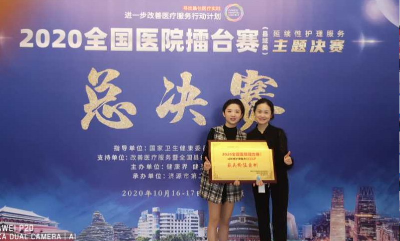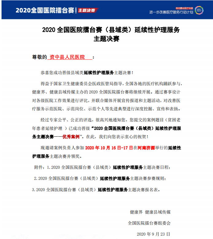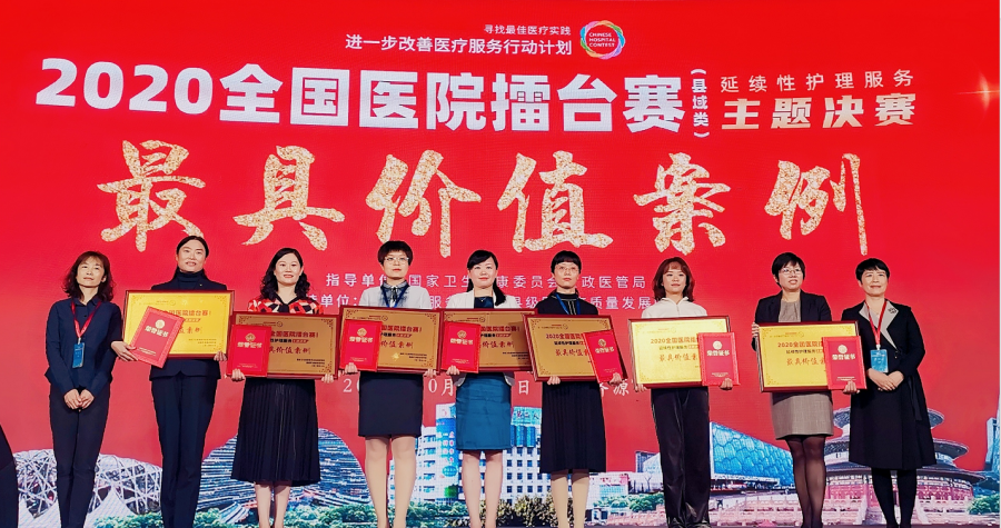 9月23日,经过专家评选,我院申报的《贫困老年患者居家护理服务闭环式管理新模式》成功晋级“2020全国医院擂台赛(县域类)延续性护理服务主题决赛——优秀案例”。